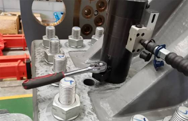 當拉伸器安裝到位后,再次用手動扭矩扳手順時針旋轉(zhuǎn)齒輪箱四方驅(qū)動裝置,保證螺母與接觸面達到預緊,安裝完成。之后,重復以上操作安裝其他拉伸器并用高壓油管互相連接 之后就可以連接超高壓泵站調(diào)至需要拉伸多力對應設定的壓力開始拉伸。