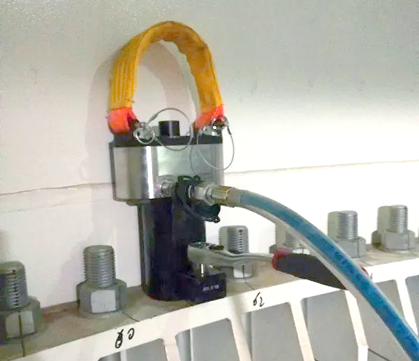 液壓拉伸器通過泵站壓力表實現(xiàn)精確的定值緊固,同步分流閥的設計使得一個泵站能同時驅動多個液壓拉伸器對多個螺栓進行同步拉伸,從而確保所有螺栓同時達到預定的載荷值。