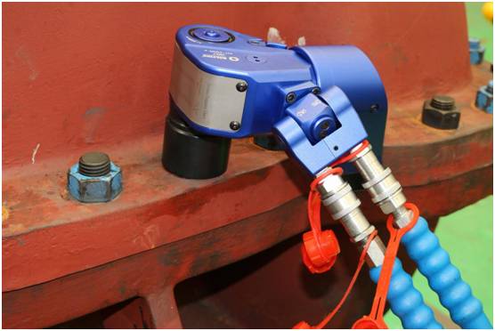 2、所有高精度設(shè)備,在螺栓終緊過(guò)程中,都應(yīng)該是對(duì)角或者四角施加扭矩,避免受力不均勻造成的法蘭變形或者密封受損,避免泄露,如采用電動(dòng)扭矩扳手或者氣動(dòng)扭矩扳手,需要兩個(gè)操作工程師用兩把電動(dòng)扭矩扳手對(duì)螺栓進(jìn)行擰緊工作,時(shí)機(jī)配合等都需要相當(dāng)默契,那么四同步的情況下呢?成本相對(duì)于液壓扳手來(lái)說(shuō)更高,采用液壓扳手則避免了這個(gè)問(wèn)題,配置的電動(dòng)液壓泵為四同步,同一臺(tái)動(dòng)力源,不可能一臺(tái)扳手是50Mpa,另一臺(tái)48Mpa,后期有需要增加到四同步,僅需再配兩把液壓扳手和套筒即可,無(wú)需再購(gòu)買(mǎi)液壓泵站。