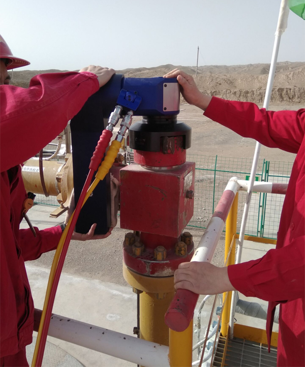 天然氣單井固定式節(jié)流閥專用液壓扭矩扳手施工現(xiàn)場(chǎng)